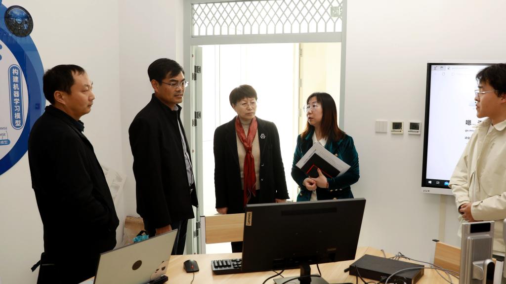 会前,韩会玲陪同谭世伟一行实地走访调研了人工智能应用开发实习实训室、智能机器人实习实训室,详细了解了产业学院的文化建设情况。