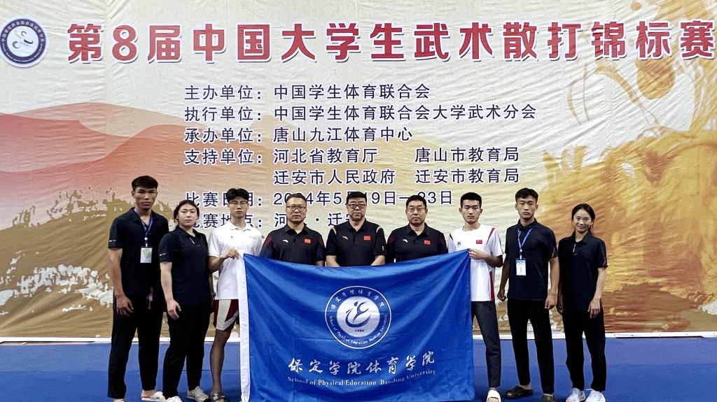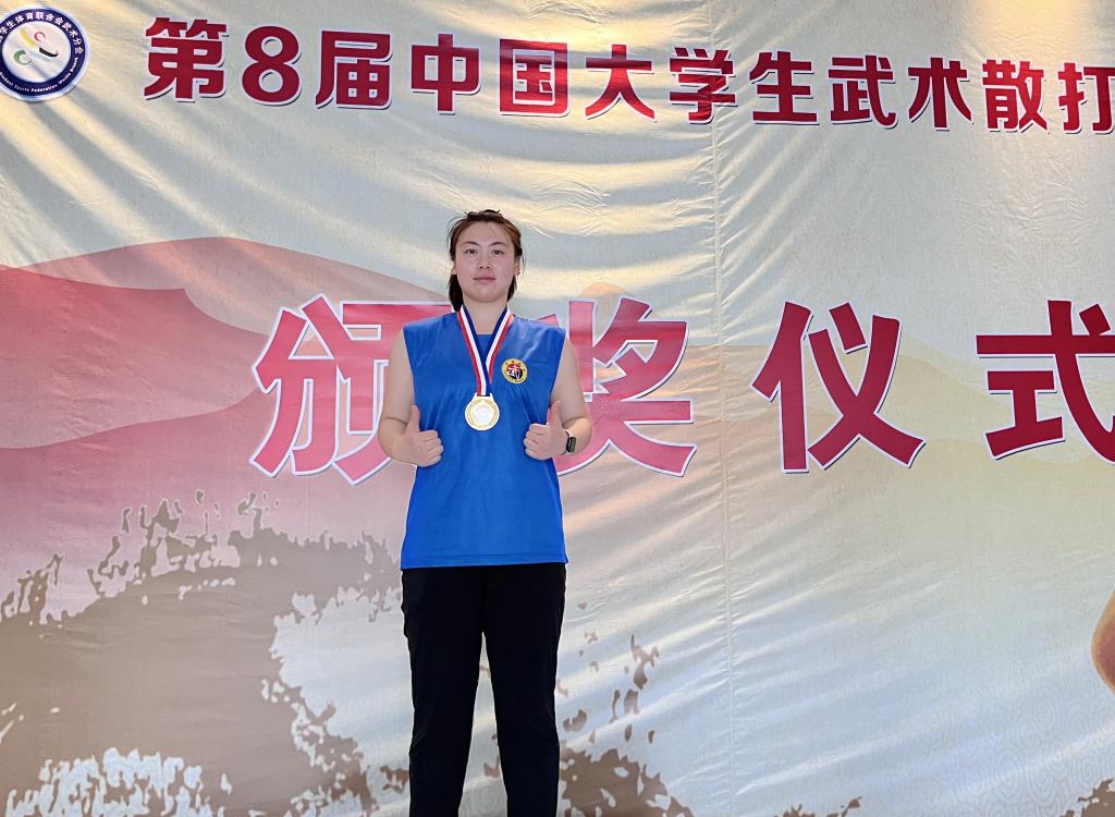 5月24日,第8届中国大学生武术散打锦标赛在河北省迁安市九江体育中心落下帷幕,本届赛事吸引了来自清华大学、北京大学、北京体育大学等全国165所高校的1300余名运动员同台竞技。由体育学院师生组成的我校代表队,在比赛中不惧困难、顽强拼搏、勇于超越,取得了良好成绩,其中,胡佳慧以出色的表现夺得女子甲组B75公斤级冠军。