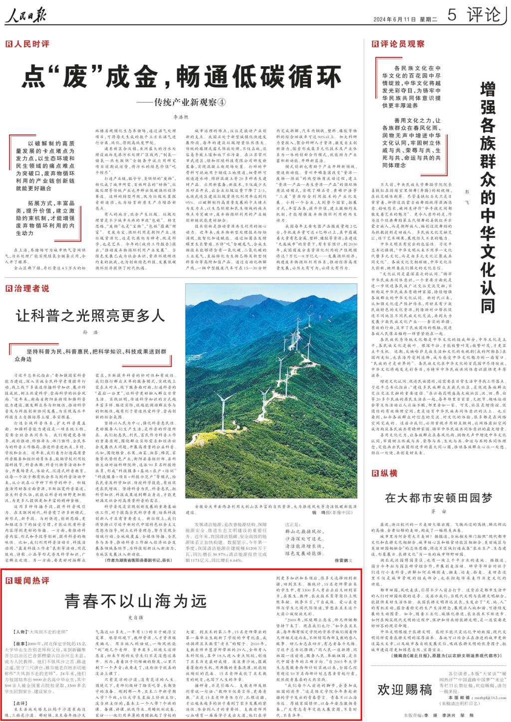 6月11日,《人民日报》第五版“暖闻热评”栏目以“青春不以山海为远”为题点评报道我校西部支教毕业生群体感人事迹。
