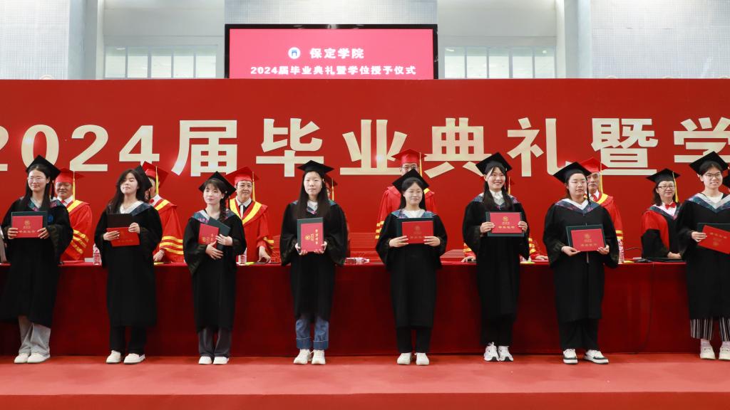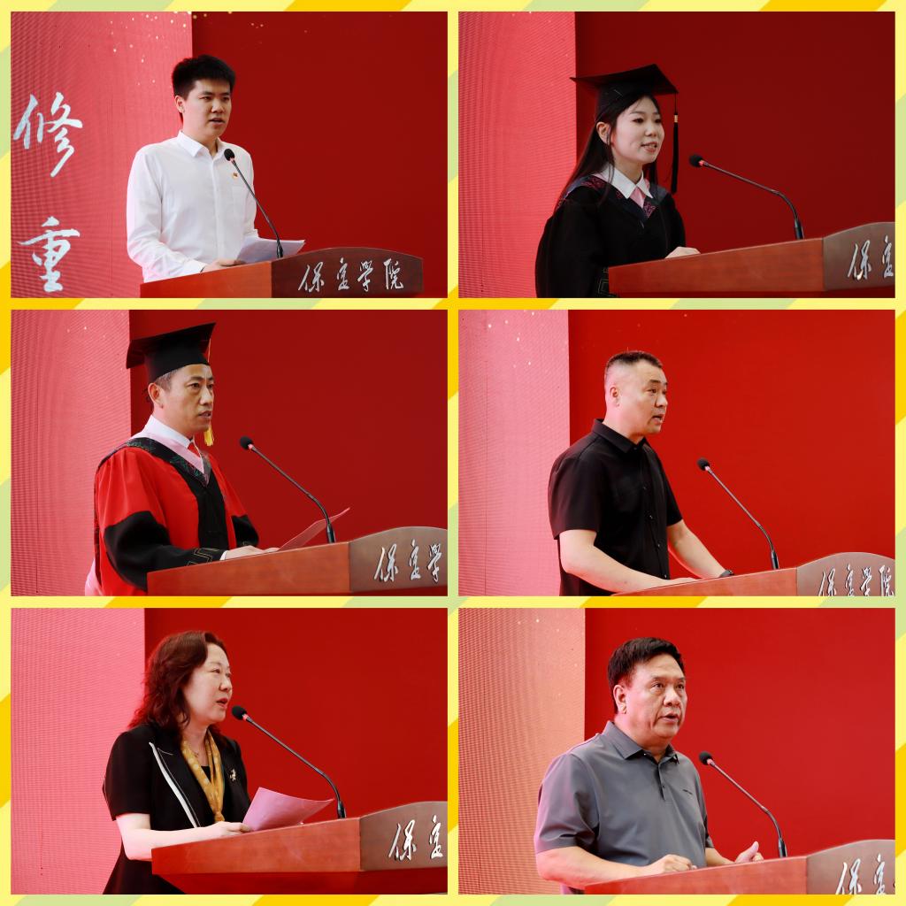 在校生代表、数据科学与软件工程学院2021级软件工程专业学生马睿辰;毕业生代表、马克思主义学院2020级思想政治教育专业学生王畅;教师代表、美术与设计学院院长金星;毕业生家长代表、文物与博物馆学院2020级历史学专业学生赵梓涵家长赵明;优秀校友代表,1987届化学专业毕业生,保定十七中教育集团党委书记、总校长,河北保定外国语学校党委书记李梅;用人单位代表、保定市华中技工学校王立仁在典礼上依次发言。