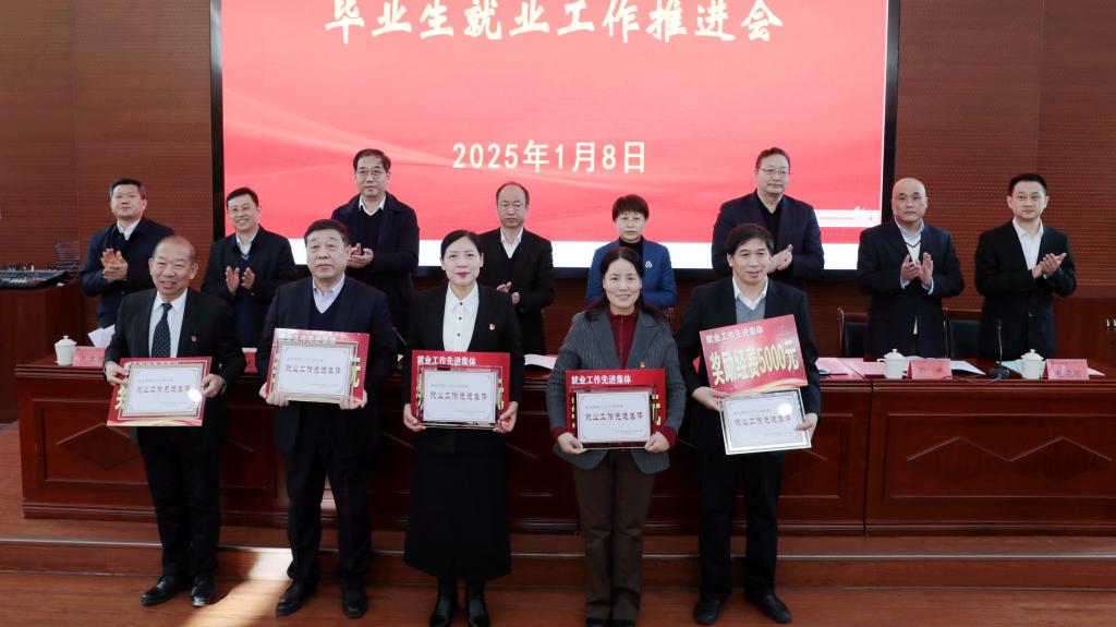与会校领导为就业工作先进集体、就业工作先进个人和就业工作个人贡献奖获得者颁发了奖牌和证书。