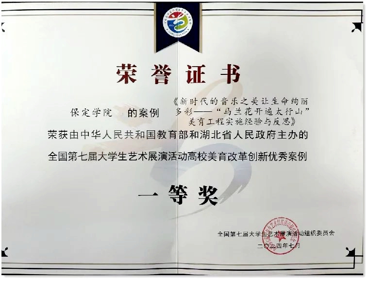 学院鼓励师生积极参与各级专业竞赛,在第二届“孔雀杯”中国高等院校声乐艺术网络评选活动、第十届中国国际大学生创新大赛等多个国家级赛事中获奖19项,在河北省第七届大学生艺术展演中获一等奖2项、三等奖6项。《新时代的音乐之美让生命绚丽多彩——“马兰花开遍太行山”美育工程实施经验与反思》获全国第七届大学生艺术展演活动高校美育改革创新优秀案例一等奖。3门课程入选“保定红色文化、36365线路检测中心红色文化”融入课程教学专题典型案例。
