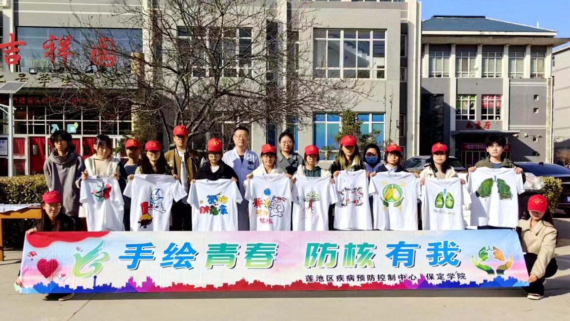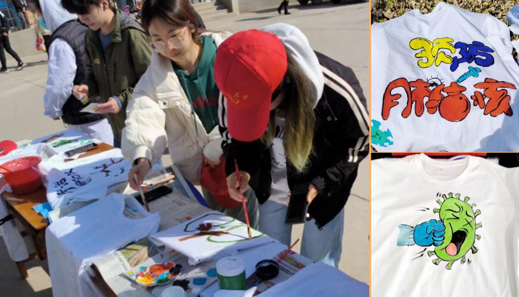 在校医院西侧广场上,“手绘青春 防核有我”防控结核宣传品发放活动也在火热进行中。美术与设计学院志愿者们设计绘制的防控结核主题T恤衫得到了师生们的一致好评。
