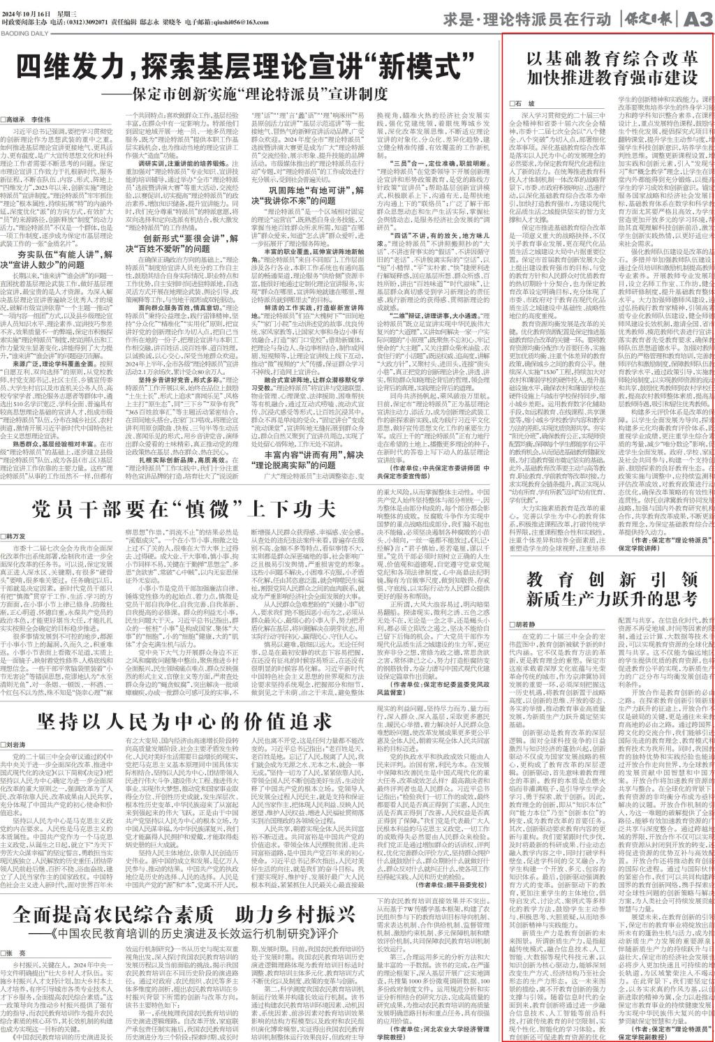 日前,中共保定市委宣传部、保定市社会发展研究院组织开展了党的二十届三中全会精神“专家访谈”活动,我校教师充分发挥专业优势,为保定高质量发展积极建言献策。其中,胡若静的《教育创新引领新质生产力跃升的战略思考》和石坡的《以基础教育综合改革加快推进教育强市建设》两篇理论文章被采纳并刊发在《保定日报》“求是·理论特派员在行动”专栏。